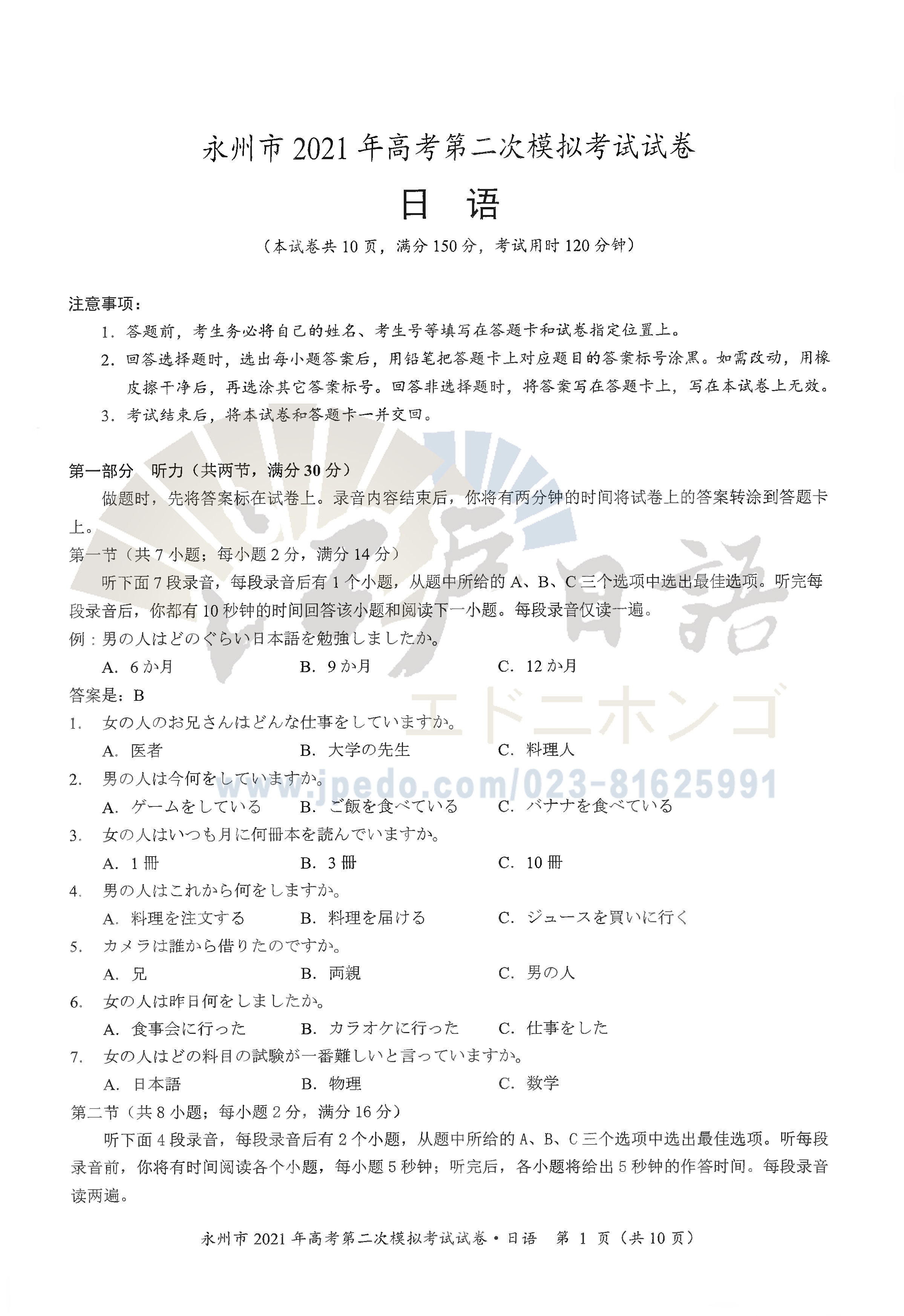 之前的文章中重庆日语培训的老师分享了2021年“八省联考日语真题”以及“广东省“百越名校联盟日语试卷”等高考日语真题,今天重庆日语的老师接着分享“2021年永州市高考第二次模拟考试试卷”。对日语高考感兴趣的小伙伴可以关注重庆江户日语官方网站获取第一手学习资料哦。