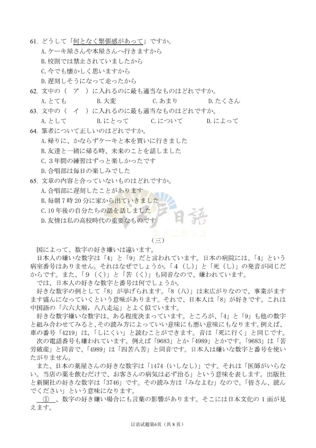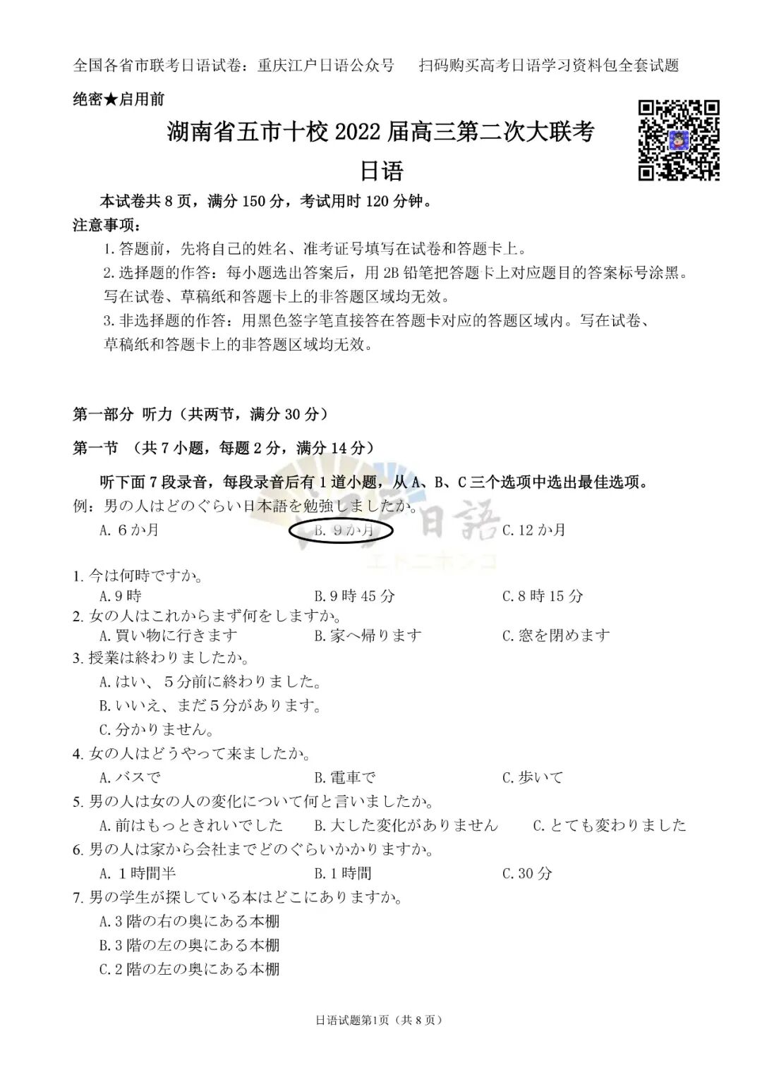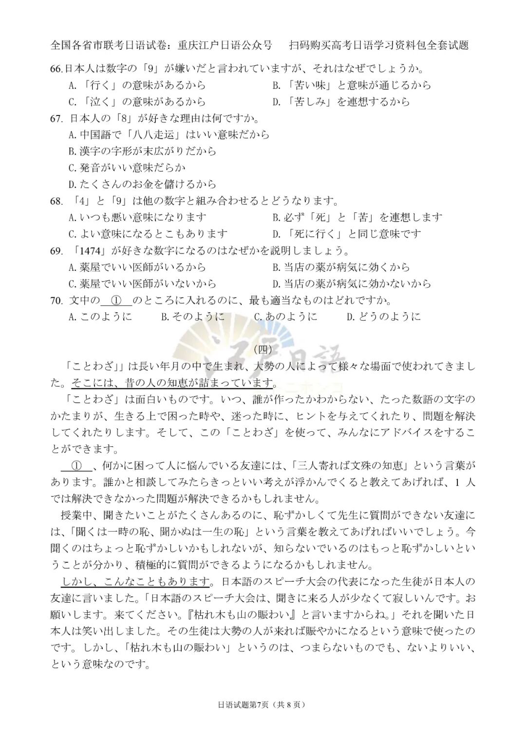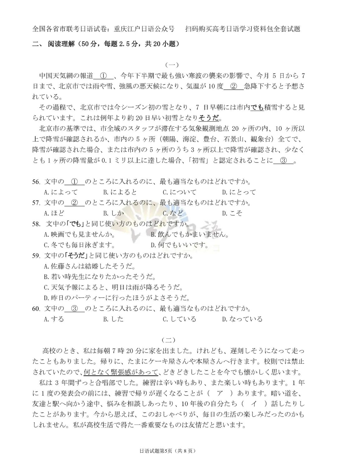 2、关注重庆江户日语微信公众号(cqjhry),回复“湖南二次联考”或者“五市十校二次联考”即可获取本套试题及答案。