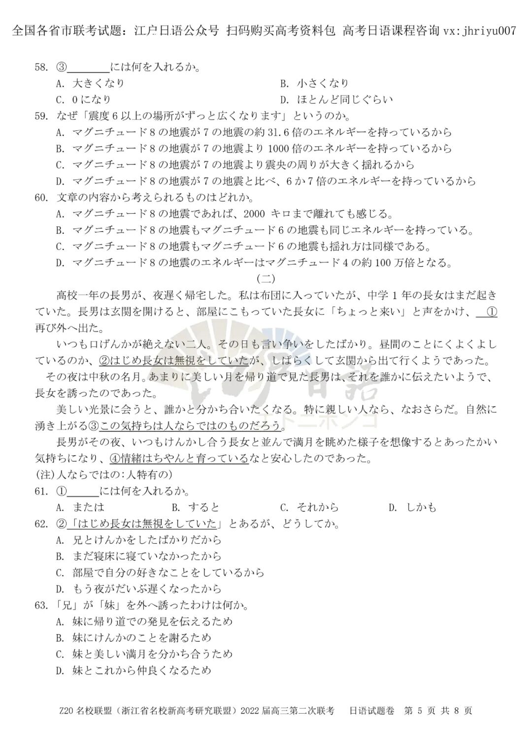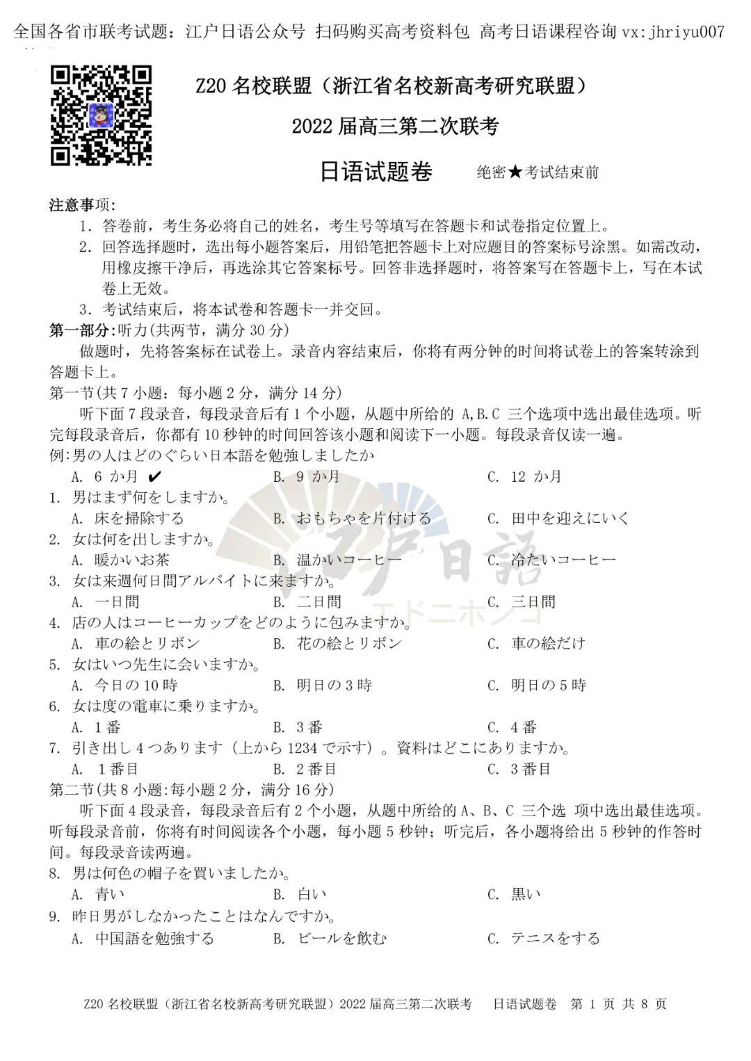 浙江Z20名校联盟2022届高三第二次联考日语试卷
