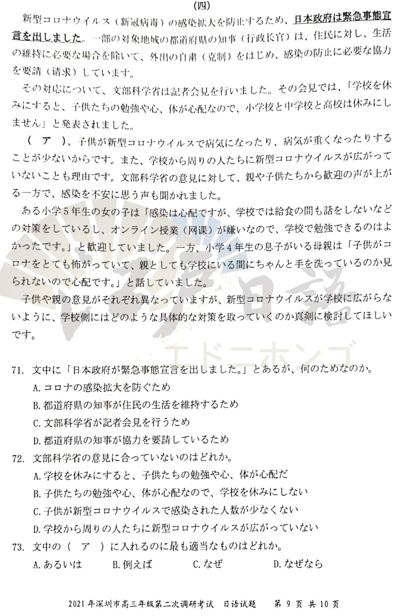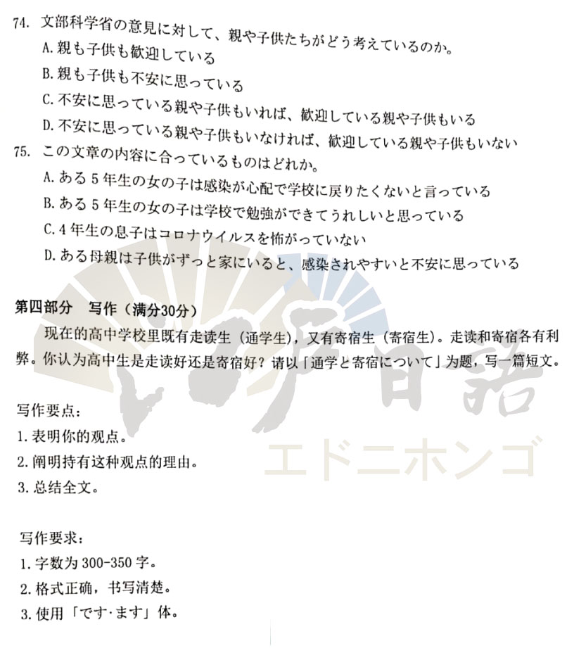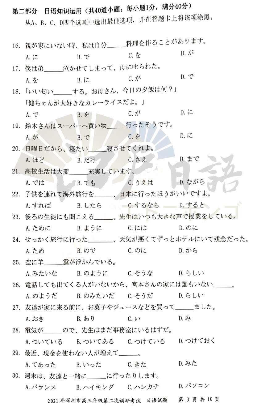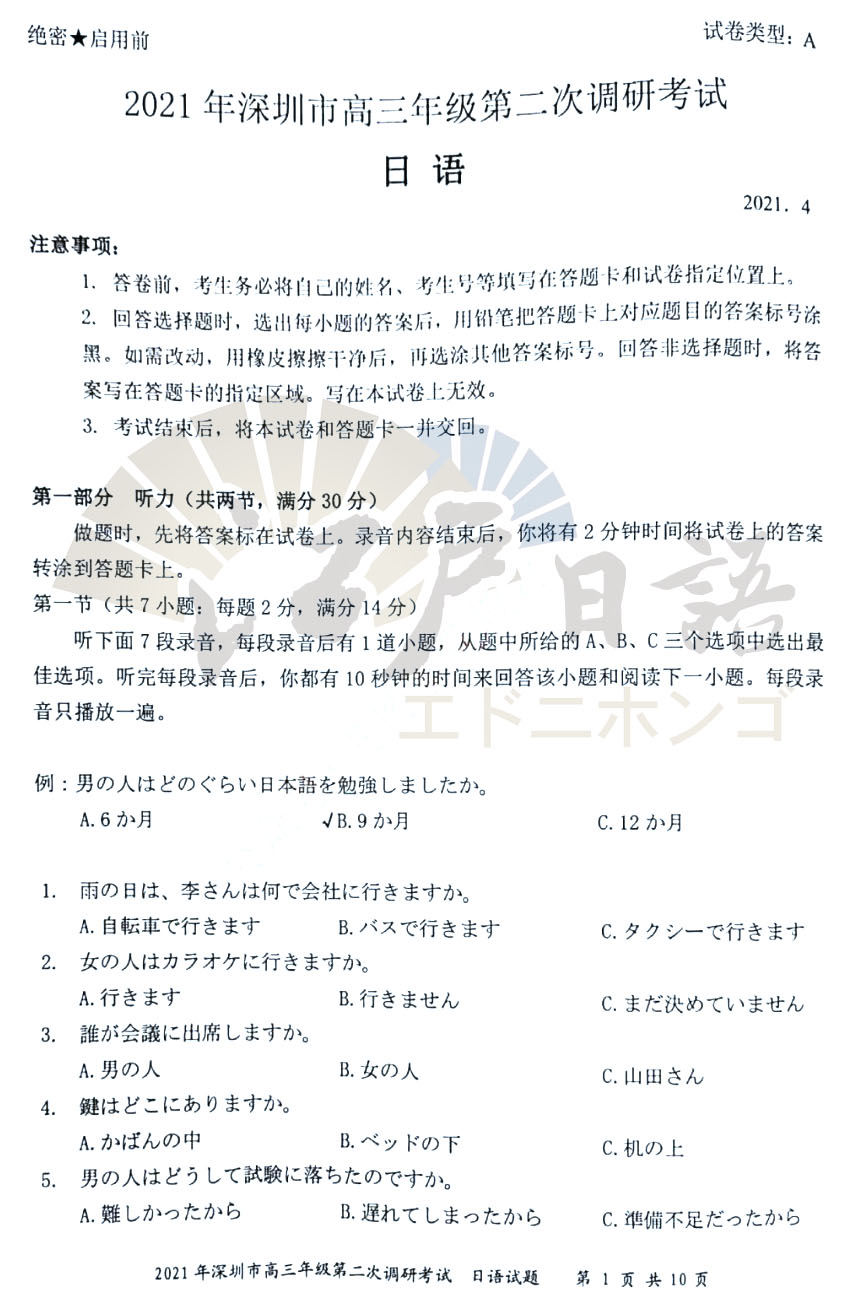 2021年高考日语倒计时35天,距离高考还有不足50天的时间,很多重庆日语培训的小伙伴都已经进入了Z后的复习时间。抓住每一分每一秒加紧复习,之前重庆日语的老师分享了全国的高考日语真题,包括:江苏二模、广东一模、广东二模、广东佛山一模等日语考试真题。今天考级日语老师接着分享《2021年深圳(二模)日语试题》,感兴趣的小伙伴可以通过关注重庆江户日语微信公众号(cqjhry)获取听力音频及答案哦。
