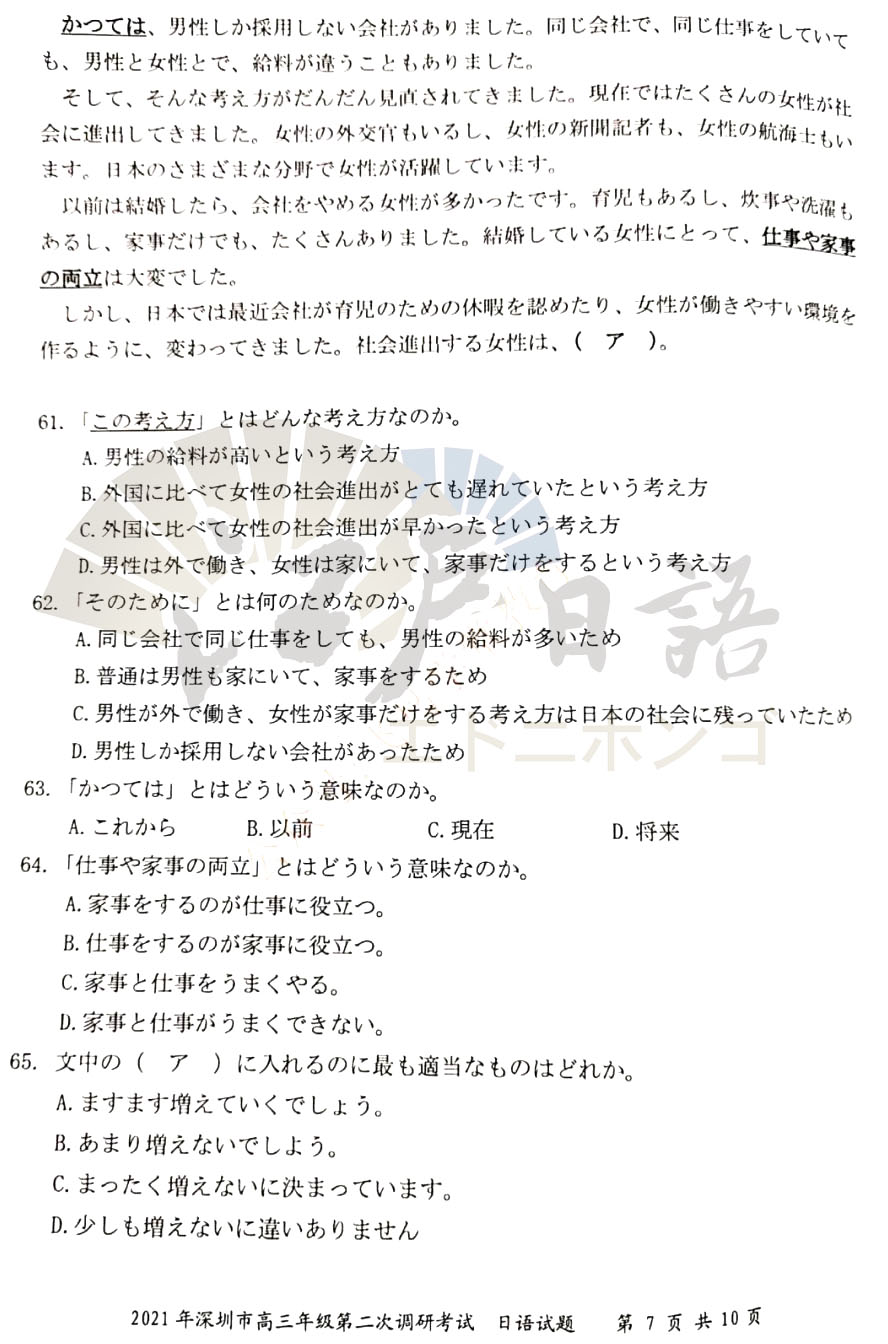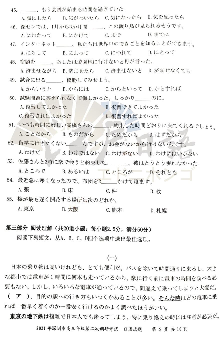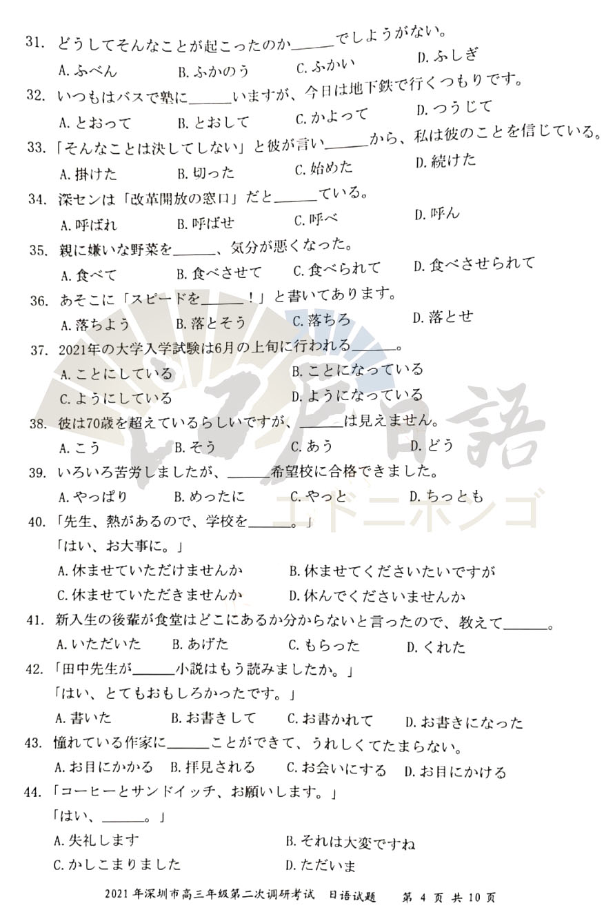 2021年高考日语倒计时35天,距离高考还有不足50天的时间,很多重庆日语培训的小伙伴都已经进入了Z后的复习时间。抓住每一分每一秒加紧复习,之前重庆日语的老师分享了全国的高考日语真题,包括:江苏二模、广东一模、广东二模、广东佛山一模等日语考试真题。今天考级日语老师接着分享《2021年深圳(二模)日语试题》,感兴趣的小伙伴可以通过关注重庆江户日语微信公众号(cqjhry)获取听力音频及答案哦。