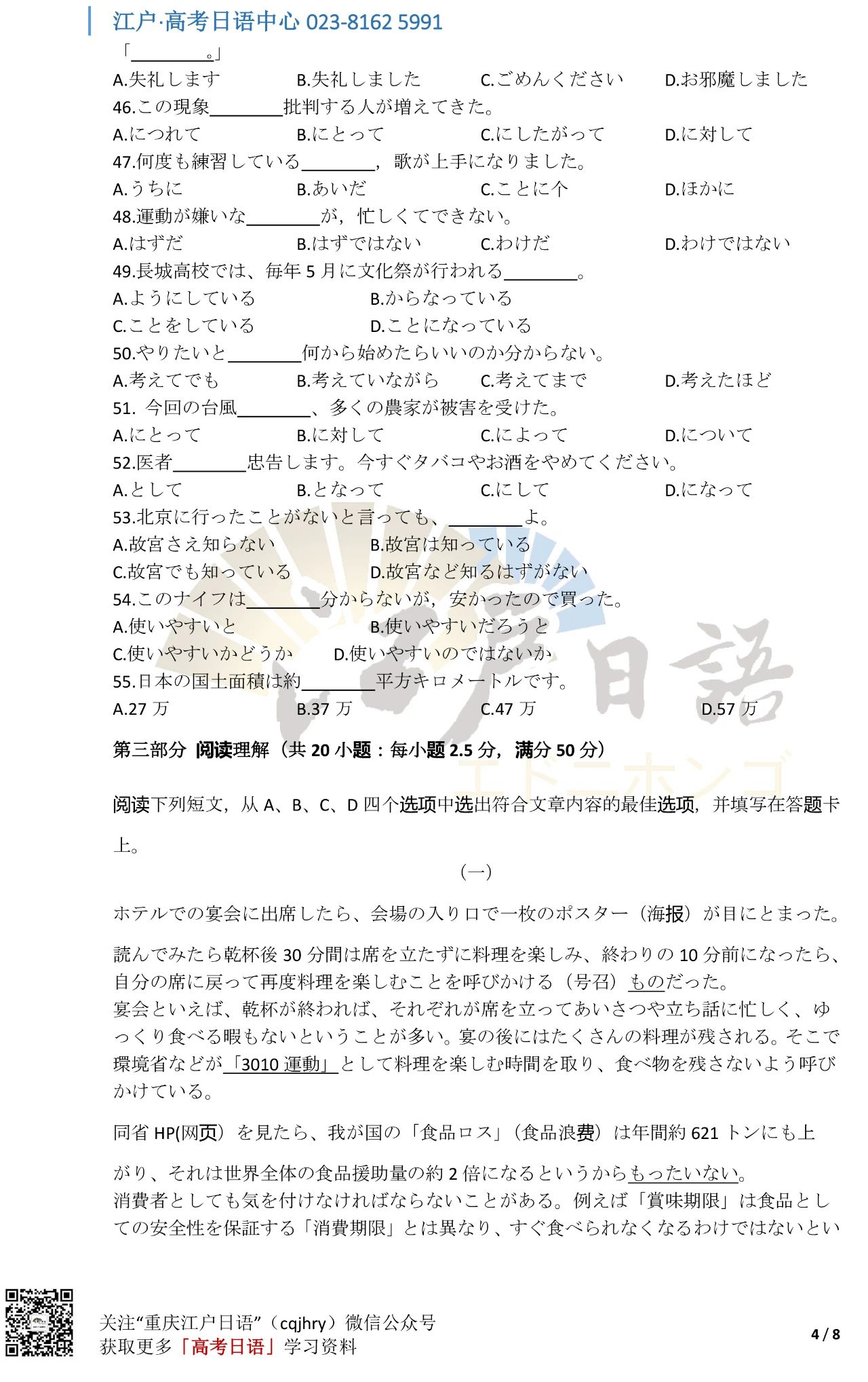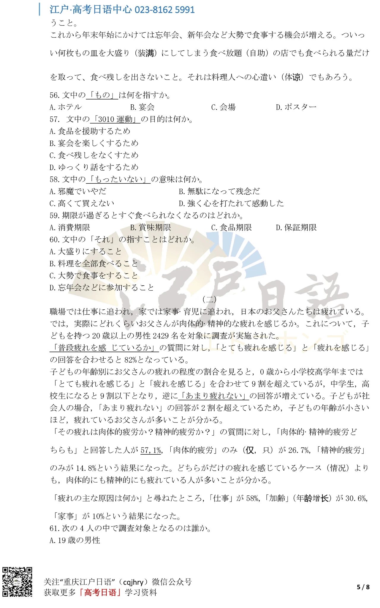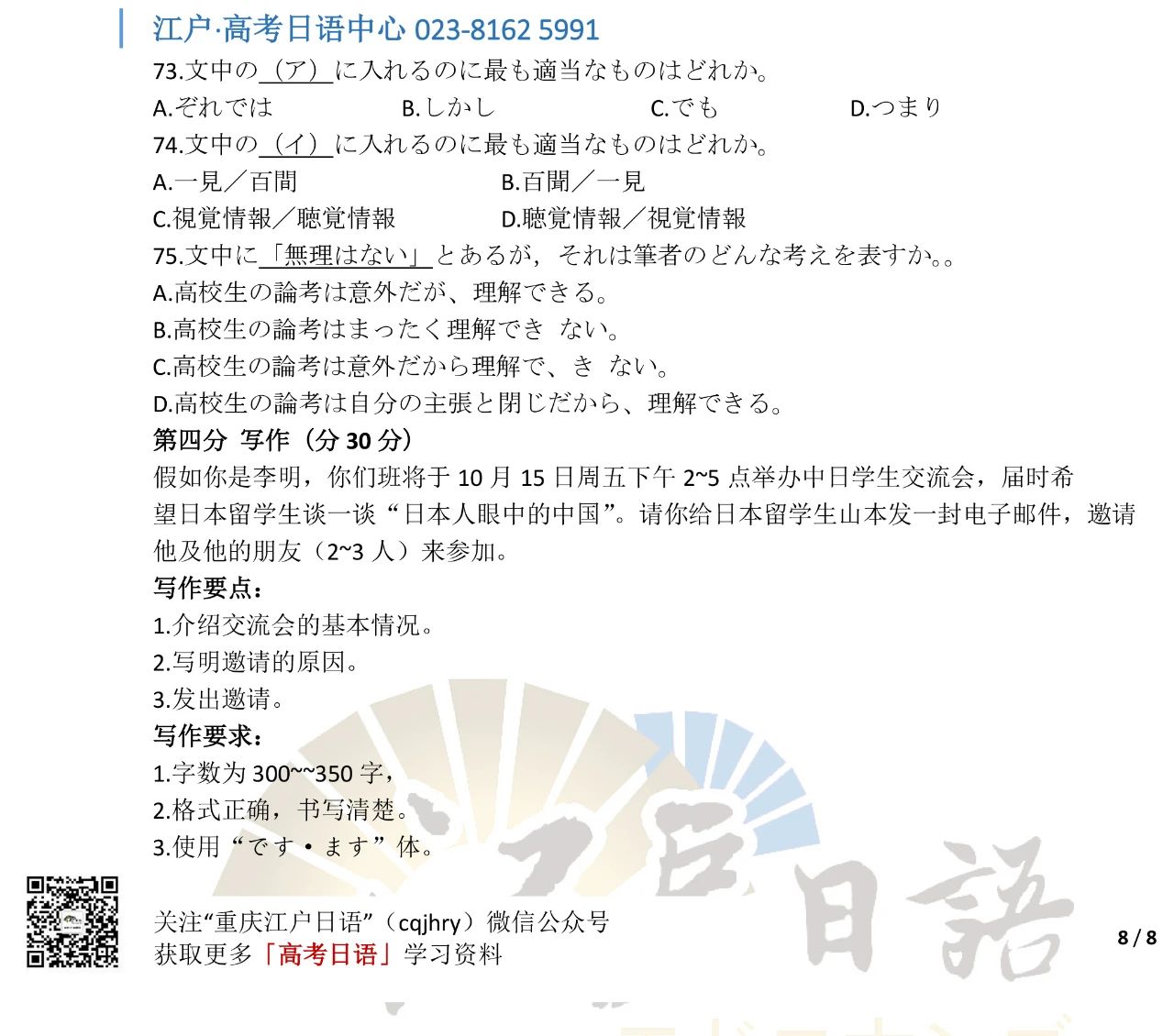 关注重庆江户日语微信公众号(cqjhry)或扫描上方二维码回复“2021”即可获取真题答案哦。
