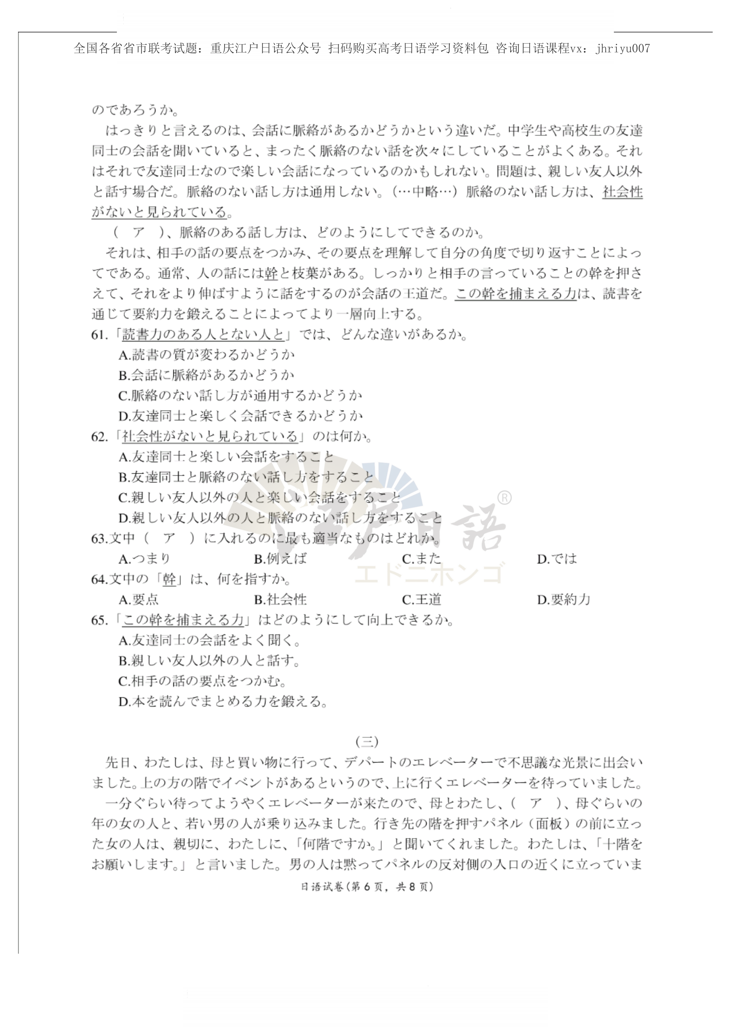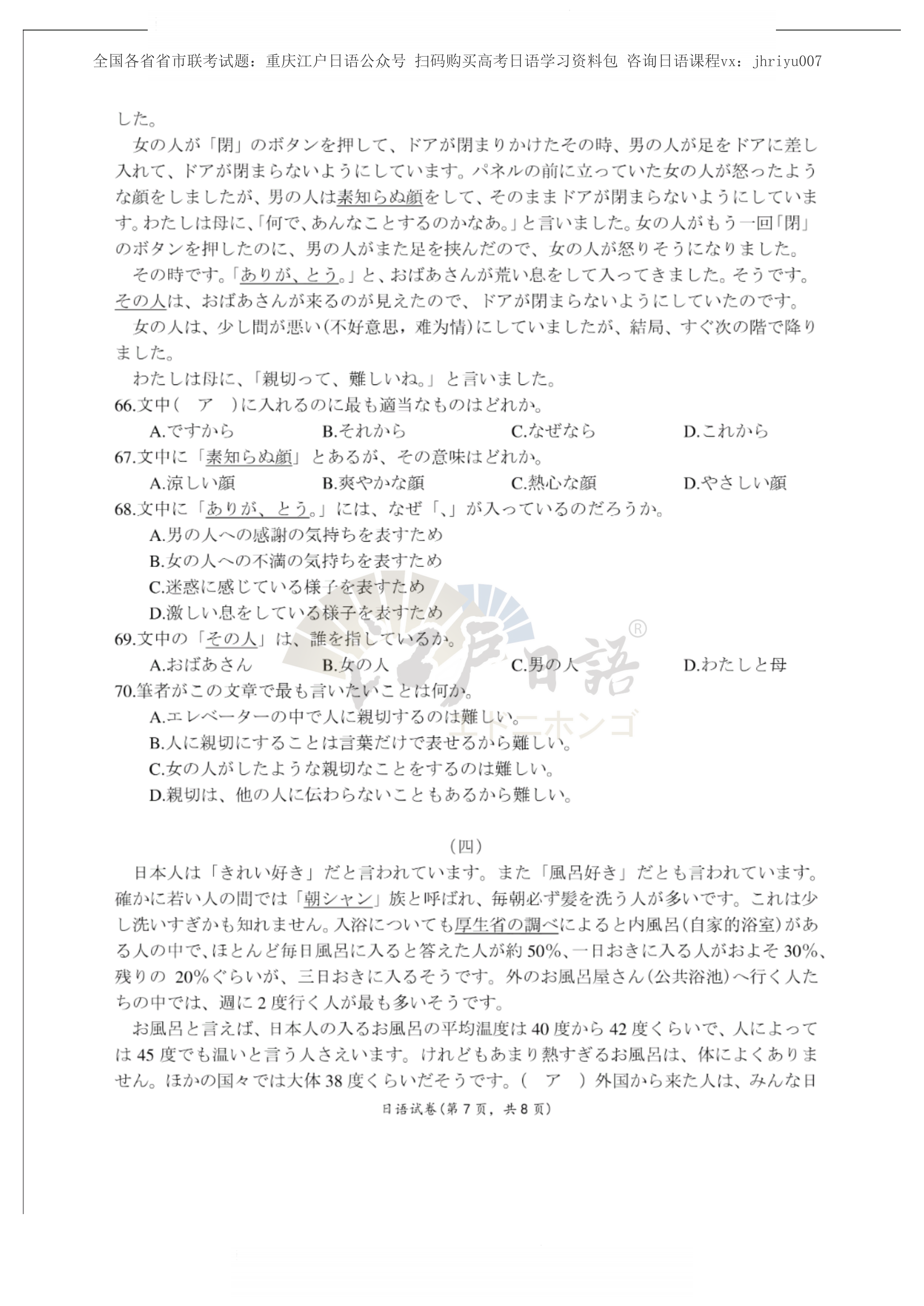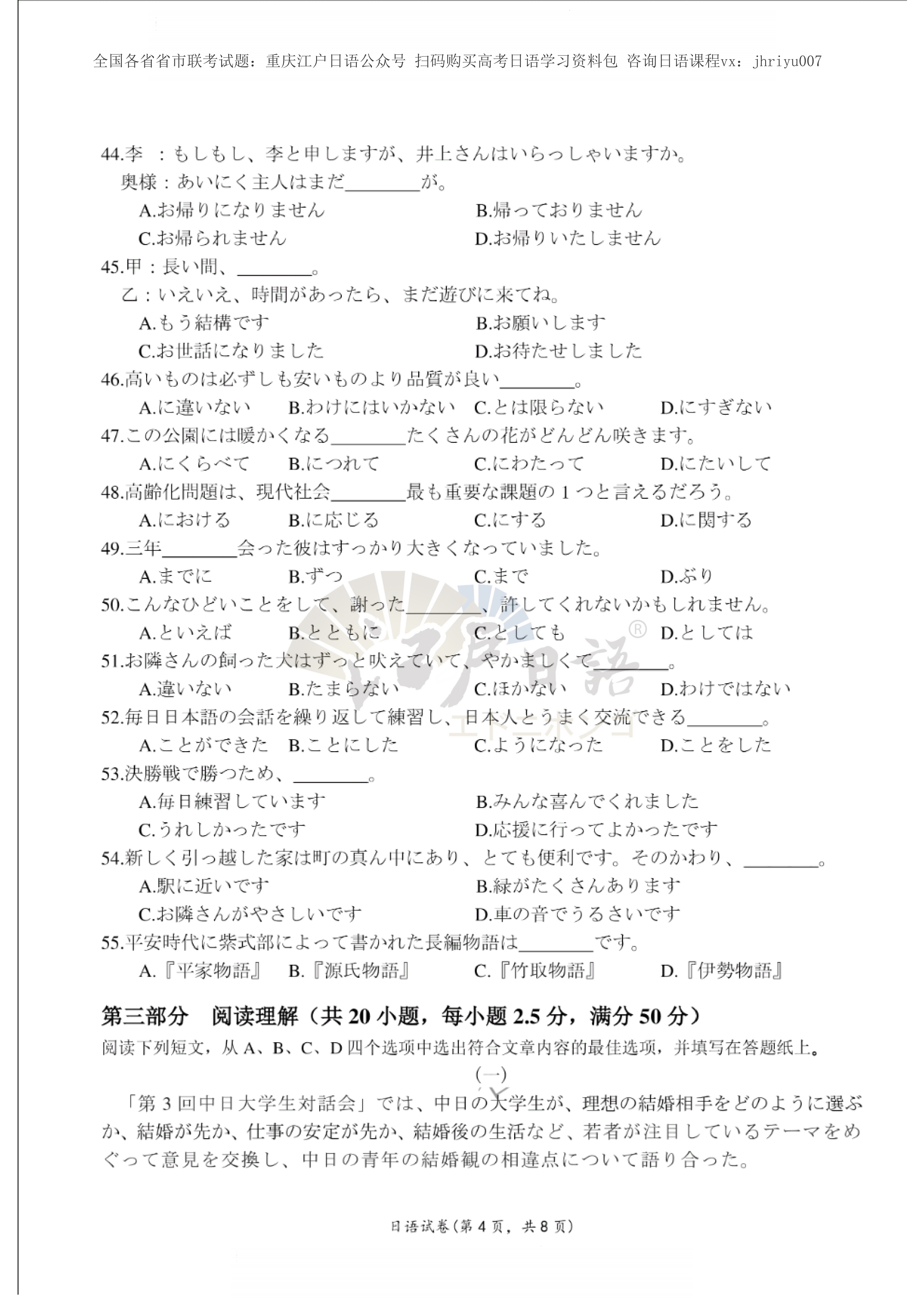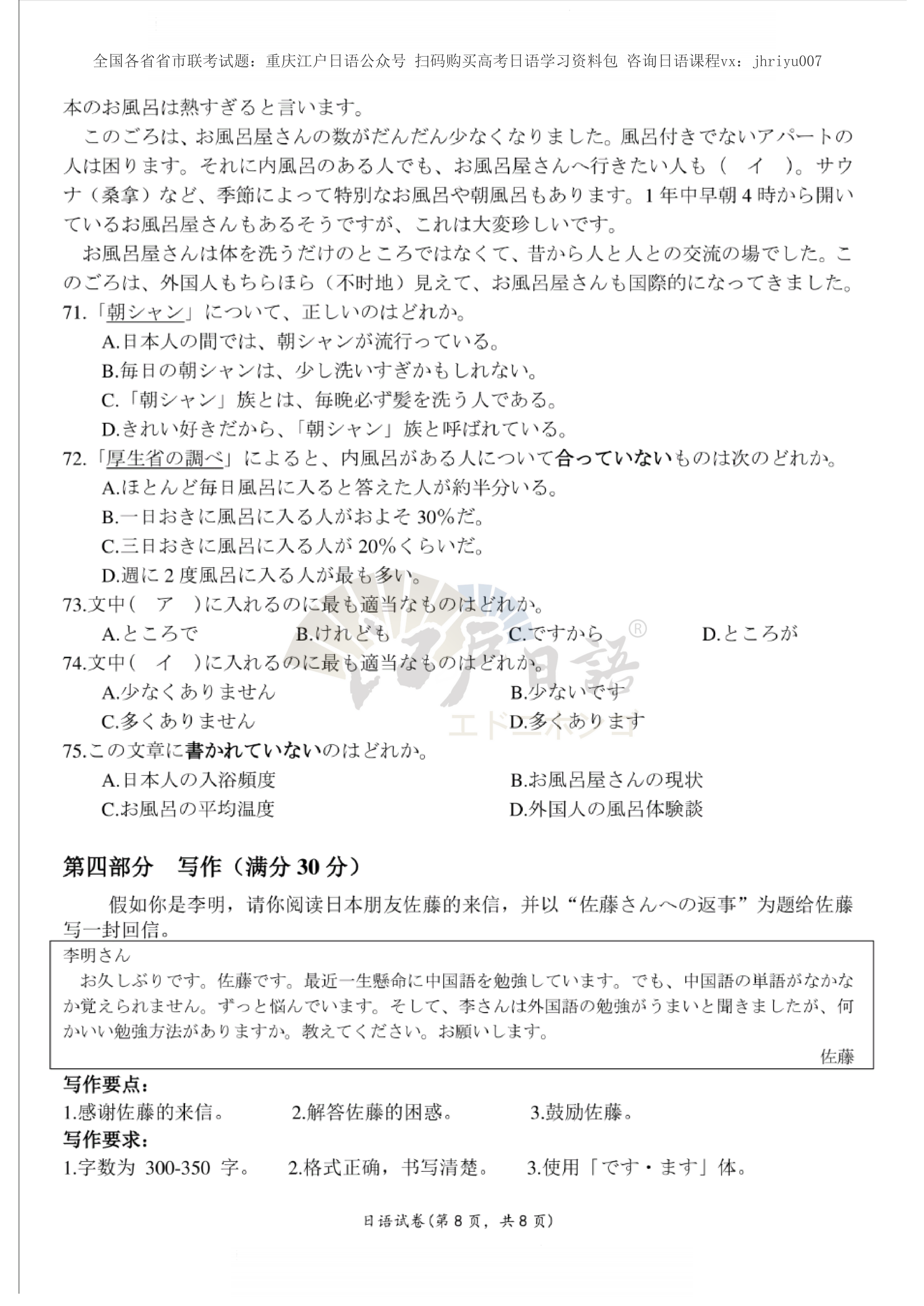 2、关注重庆江户日语微信公众号(cqjhry),保存图片打开淘宝扫一扫即可购买一份完整试题(电子档)。