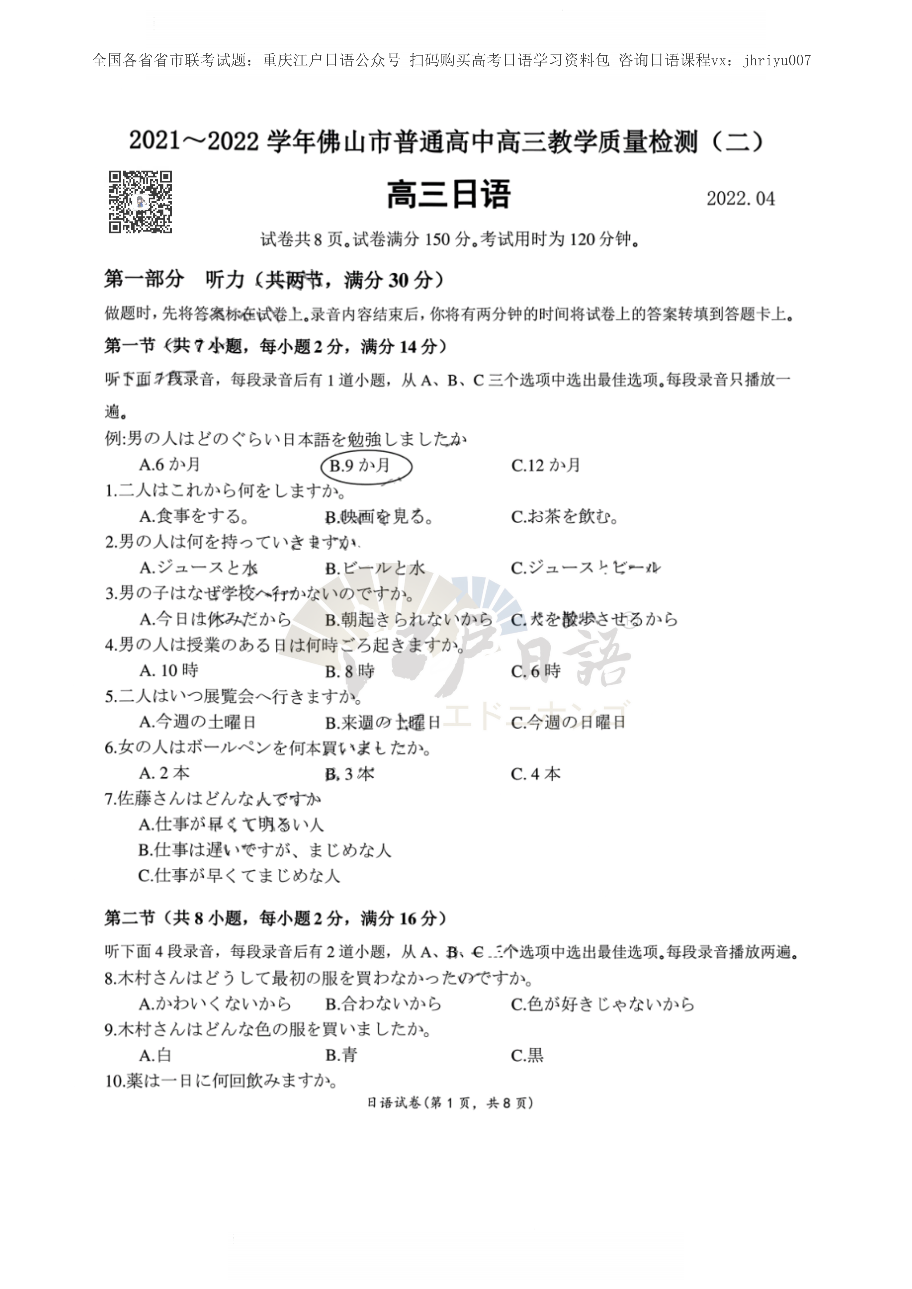 2021-2022学年佛山市普通高中高三教学质量检测(二)日语试卷
